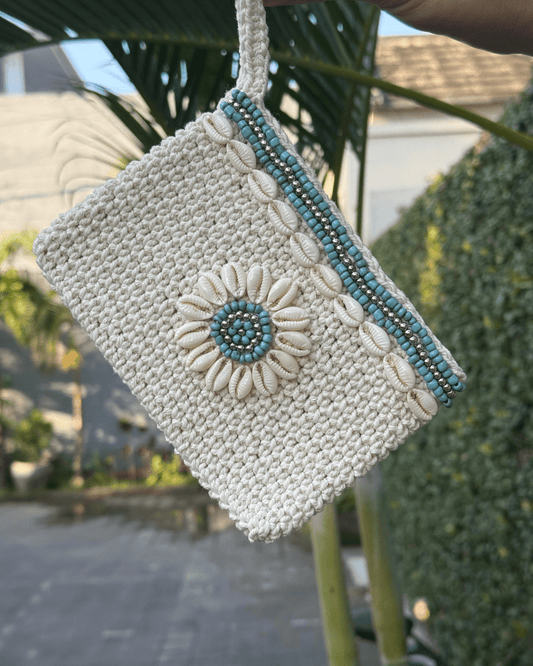 Gehäkelte Bali Tasche mit Muscheln - Blau