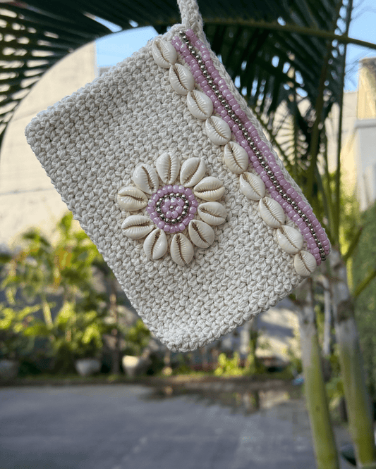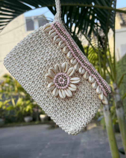 Gehäkelte Bali Tasche mit Muscheln - Rosa